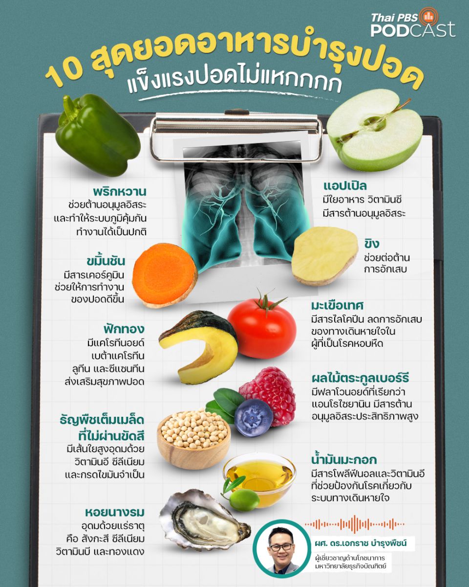 นอกจากอาหาร 10 ชนิดนี้แล้ว ยังรวมถึงการกินผักและผลไม้เป็นประจำที่ช่วยลดความเสี่ยงการเกิดโรคปอด โดยกินให้ได้อย่างน้อยวันละ 400 กรัม ไม่เพียงแต่มีสารต้านอนุมูลอิสระเท่านั้น แต่ยังช่วยสร้างภูมิต้านทานและเสริมการทำงานของเม็ดเลือดขาวให้มีประสิทธิภาพในการกำจัดเชื้อโรคมากยิ่งขึ้น ฟังผู้เชี่ยวชาญด้านโภชนาการเล่าขยายความสำคัญของอาหารแต่ละชนิดที่รายการ โรงหมอ ทาง Thai PBS Podcast