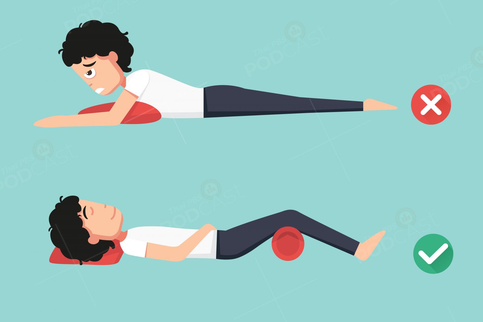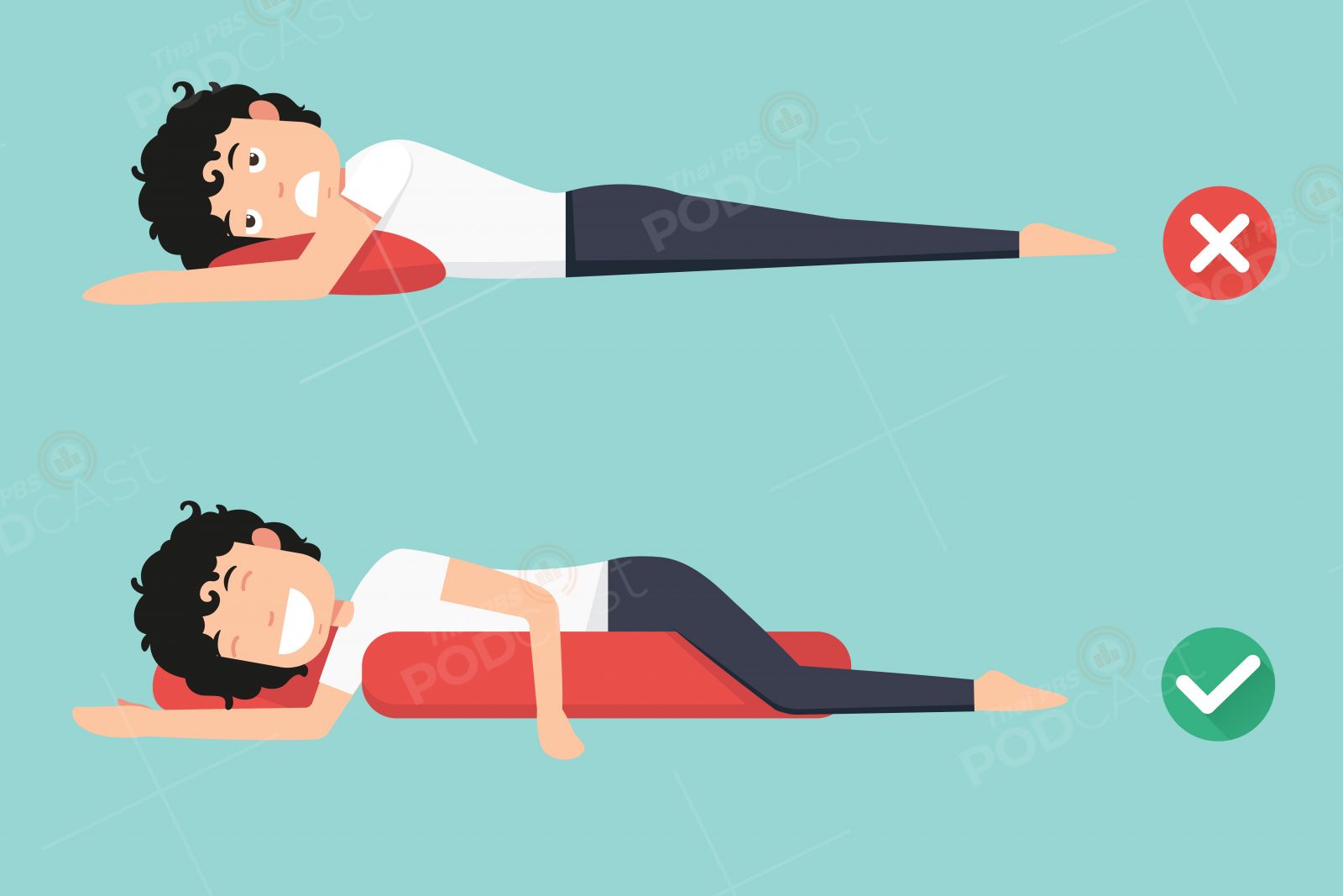 - ผู้ที่ปวดเมื่อยคอและหลัง ให้นอนหงายแล้วเอาหมอนรองใต้หัวเข่า หรือนอนตะแคง