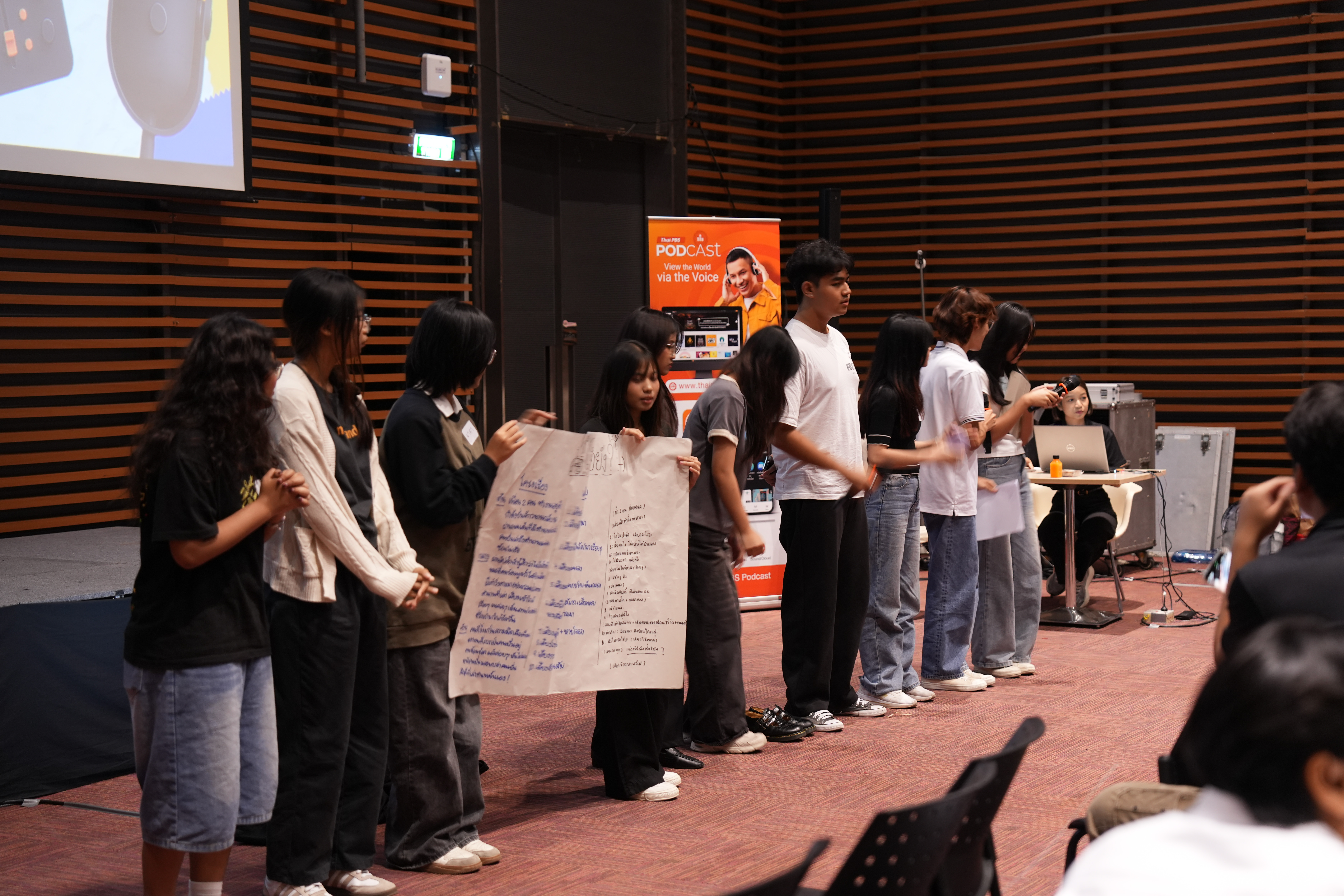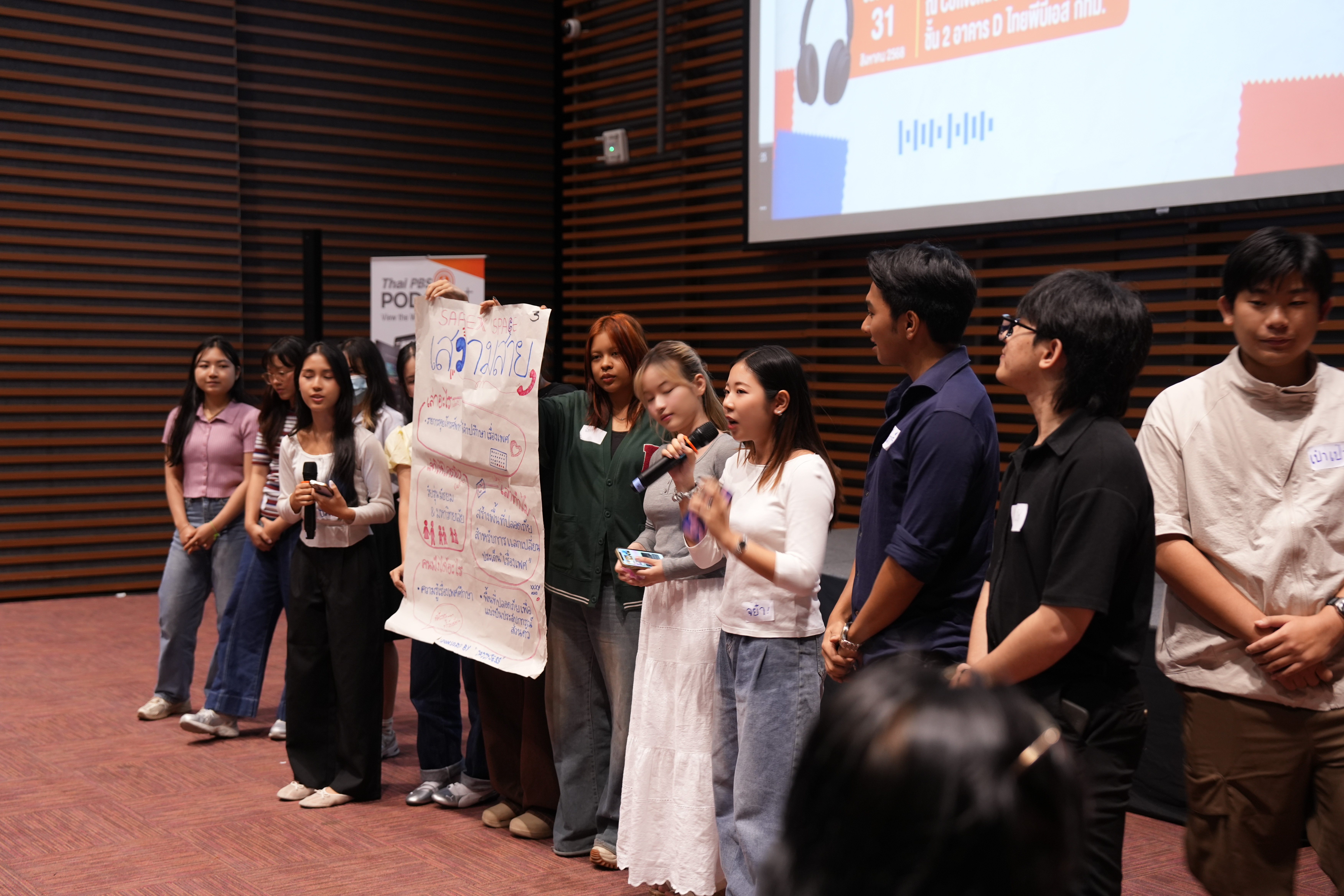 กิจกรรมในช่วงเช้าเป็นการบรรยายให้ความรู้พร้อมเปิดตัวอย่างเสียงจริงจากรายการต่าง ๆ ในไทยพีบีเอสพอดแคสต์ แล้วช่วงบ่ายเป็นการฝึกอบรมเชิงปฏิบัติการโดยให้นิสิตนักศึกษาจับกลุ่มเพื่อระดมความเห็น เสนอประเด็นที่จะเล่าเรื่องด้วย “เสียง” โดยใช้เสน่ห์ของเสียงเล่าเรื่องและใช้เทคนิคการตัดต่อลำดับเสียงมาทำให้รายการสนุกสนาน มีสีสันชวนฟังมากยิ่งขึ้น หลังจากนั้นตัวแทนกลุ่มต่าง ๆ นำเสนอแนวคิดดังกล่าว พร้อมรับฟังข้อเสนอแนะทั้งจากเพื่อน ๆ อาจารย์แต่ละสถาบัน และวิทยากร